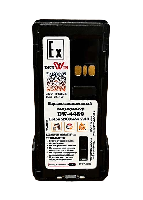 Сертифицированный взрывобезопасный аккумулятор DENWIN DW-4489 Li-Ion с емкостью 2900 мАч для радиостанции Motorola серии DP4000 TIA; Motorola серии DP4000 FM; Motorola серии APX900 FM; Motorola серии APX2000 FM. Аналог аккумулятора Motorola PMNN4489; Motorola PMNN4489A; Motorola PMNN4489B, СОВМЕСТИМ С IMPRES 2