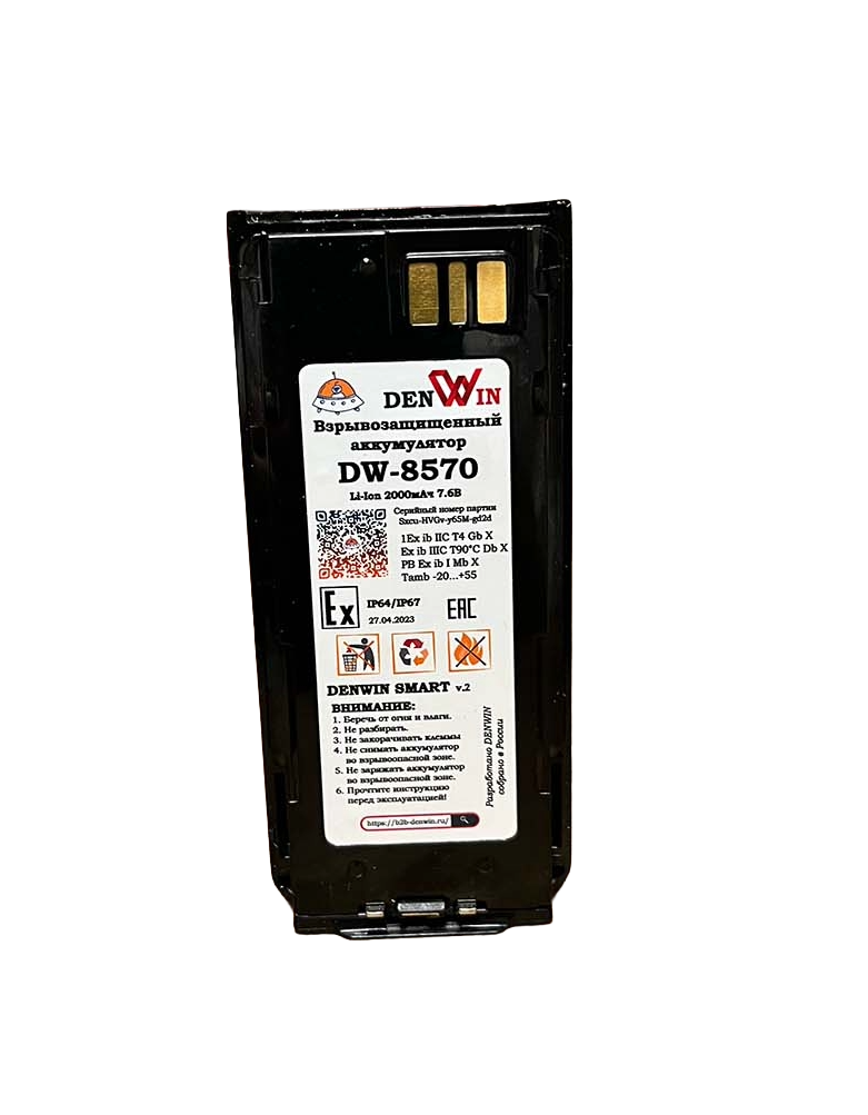Сертифицированный взрывобезопасный аккумулятор DENWIN DW-8570 Li-Ion с емкостью 2000 мАч для радиостанции Motorola серии MTP8000Ex. Аналог аккумулятора Motorola NNTN8570; Motorola NNTN8570B, СОВМЕСТИМ С IMPRES 2