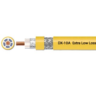Во многом схож с Belden 9913, но использует гарантированно плотную оплетку, а благодаря применению иного по конструкции диэлектрика (5-элементная сота из ПЭ вместо спирального (кордельного) диэлектрика), обладает также существенно более стабильным волновым сопротивлением. Оболочка кабеля Radiolab DX-10A изготовлена из материала, стойкого к УФ излучению (UVR-PVC). Отличная альтернатива более дорогому и жесткому ВЧ кабелю LMR-400 (аналог SCALAR DX-400) для диапазона 400-2400 МГц. Кабель DX10A требует повышенного внимания к качеству герметизации разъемов в случае его использования вне помещения: Бесклеевая термоусадка Клеевая термоусадка Клеевая среднестенная термоусадка Характеристики DX-10A Импеданс 50±2 Ом Погонная емкость 81,88 пФ/м Коэффициент укорочения 1,23 Диаметр центральной жилы 2,6 мм Материал проводника BC Диаметр диэлектрика 7,24±0,15 мм Материал диэлектрика 5-cell PE Внешний диаметр оболочки 10,3 мм Материал оболочки PVC Основной экран AF Плотность основного экрана 100% Конфигурация оплетки 24x7x0,14 мм Материал оплетки TC Плотность оплетки 89% Таблица затухания для кабеля DX-10A Частота, МГц Затухание, дБ/100м Частота, МГц Затухание, дБ/100м 150 4,8 1200 17,6 450 9,6 1800 22,8 800 13,7 1900 23,5 900 14,8 2450 27,5